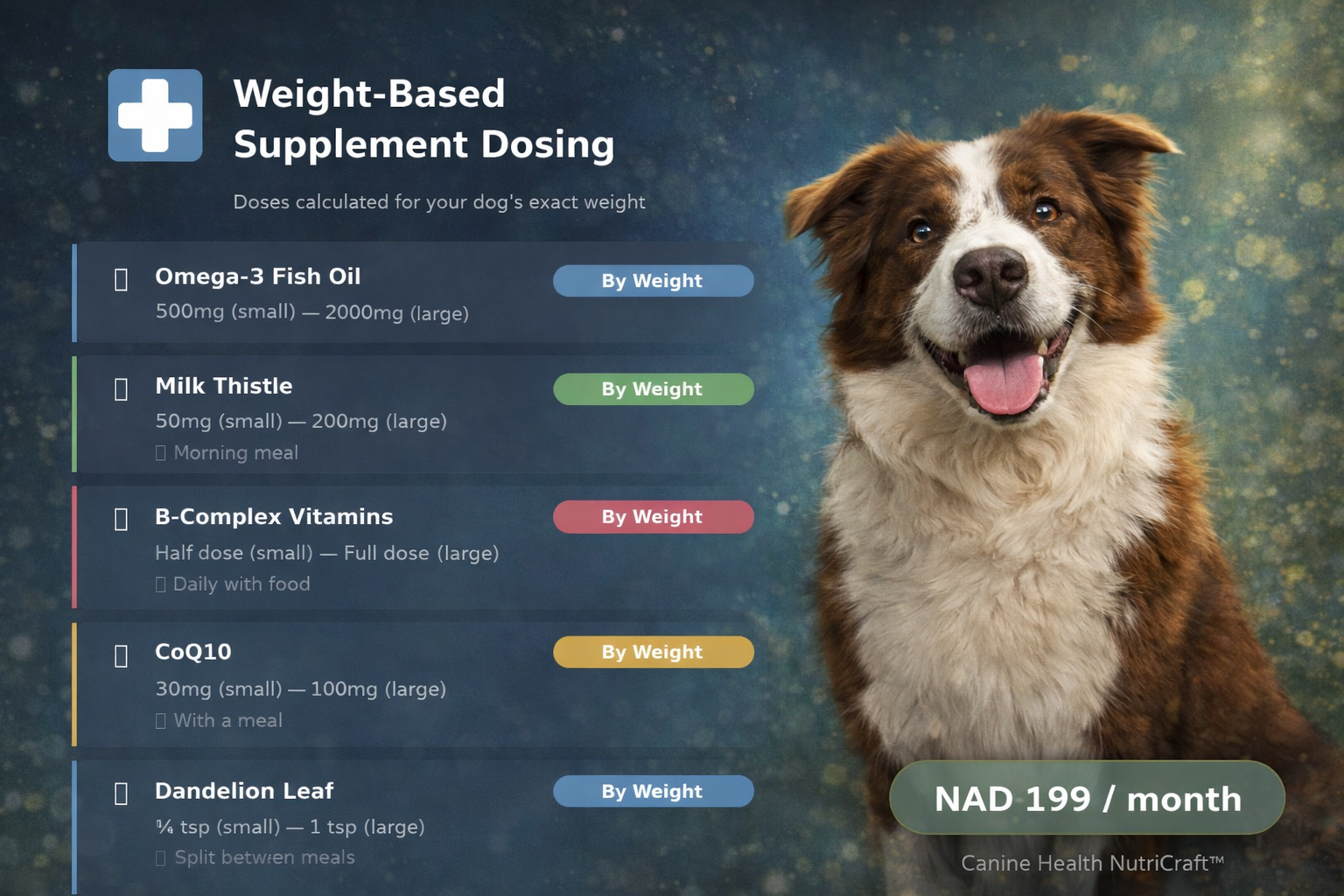 The planner includes structured supplement dosing recommendations tailored to your dog’s weight.