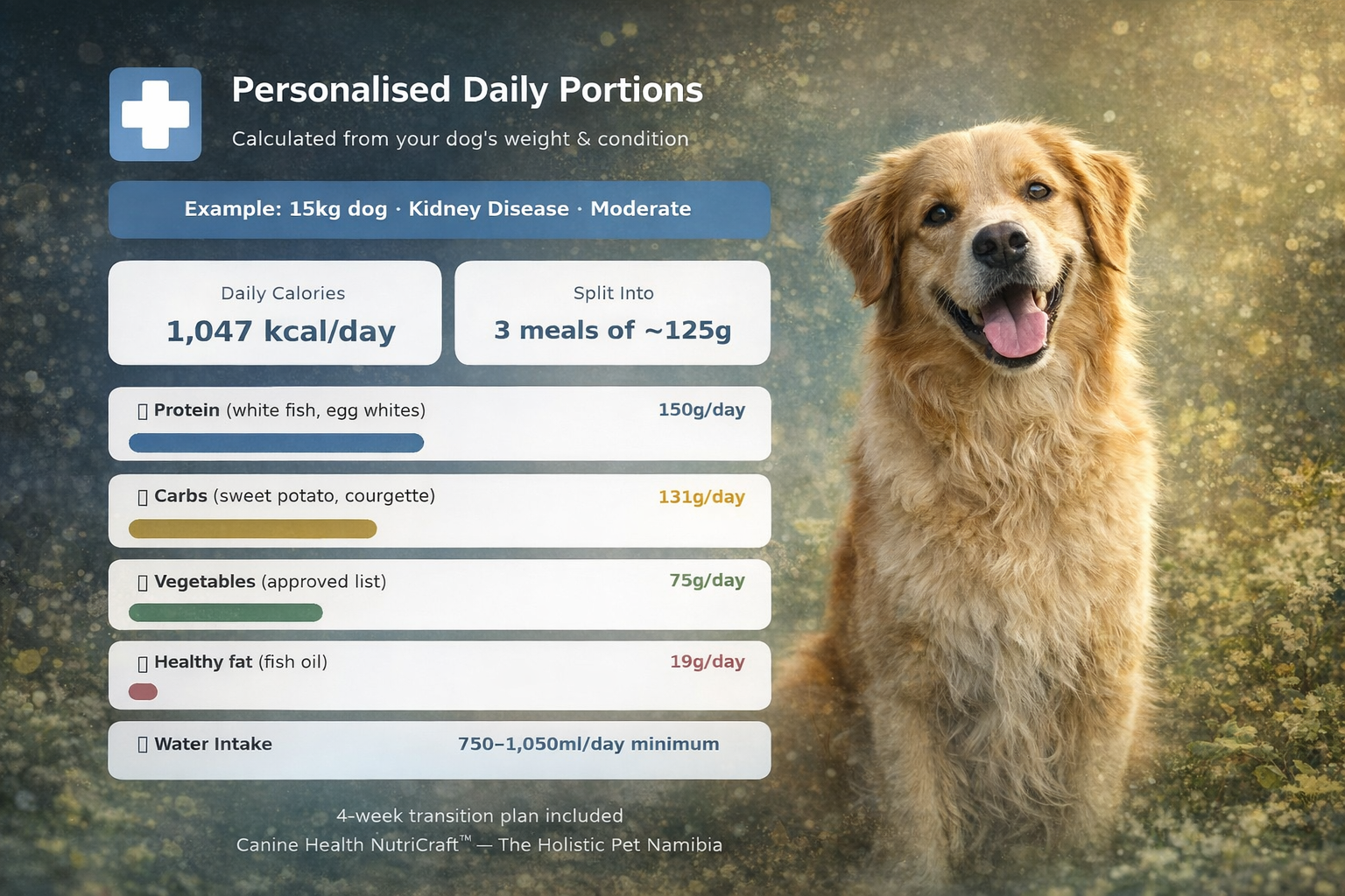 NutriCraft automatically calculates daily calorie needs and feeding portions based on your dog’s weight and condition.
