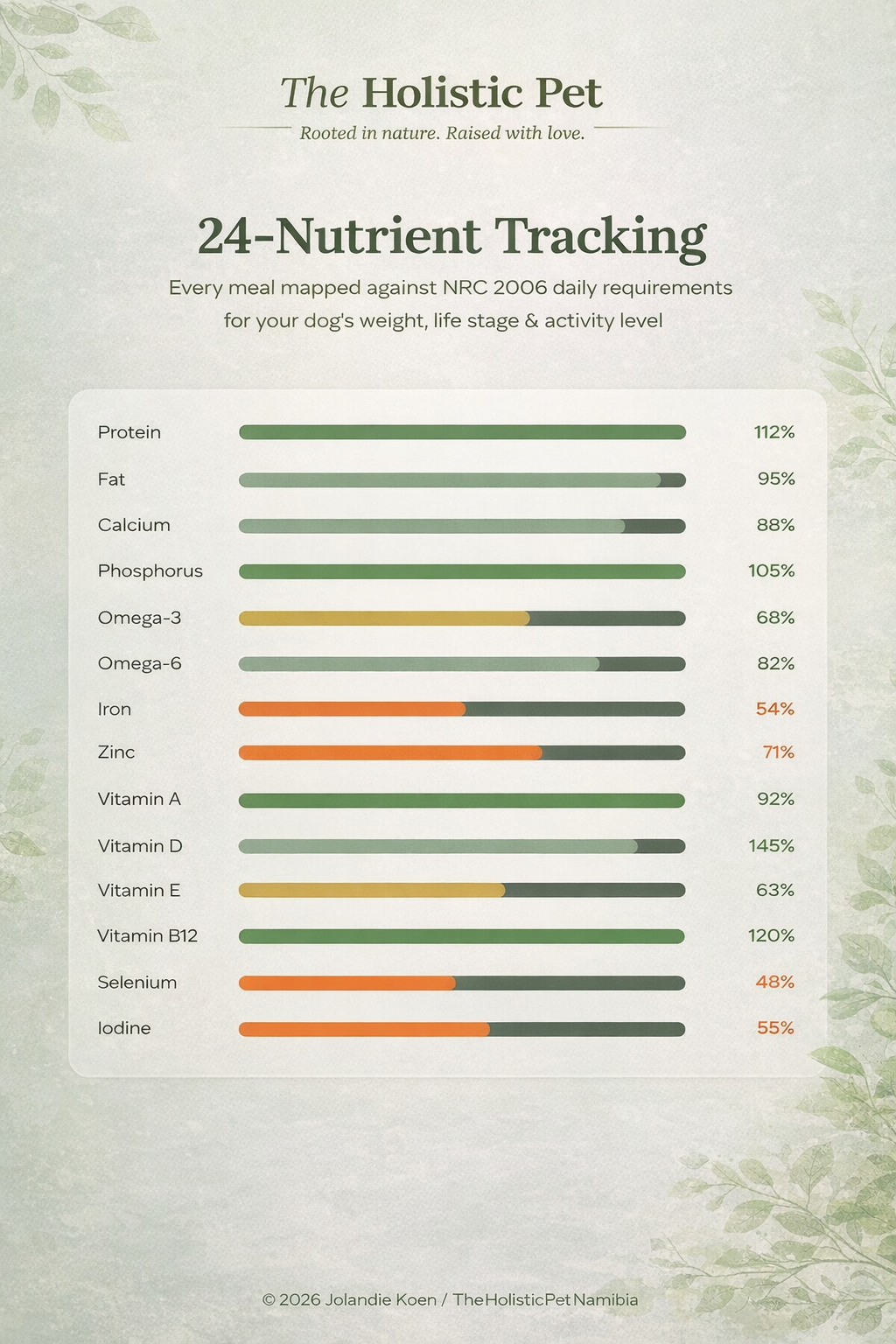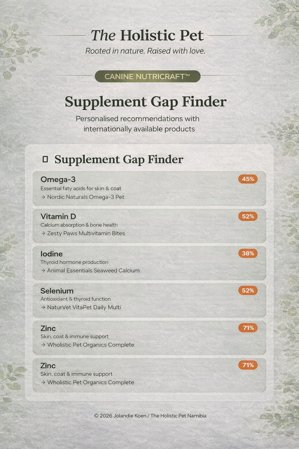 Using scientifically informed nutrient tracking based on NRC guidelines, the system evaluates your dog’s meals and highlights potential nutritional gaps. You’ll receive practical suggestions to help balance the diet naturally using whole foods and carefully selected supplements when needed.