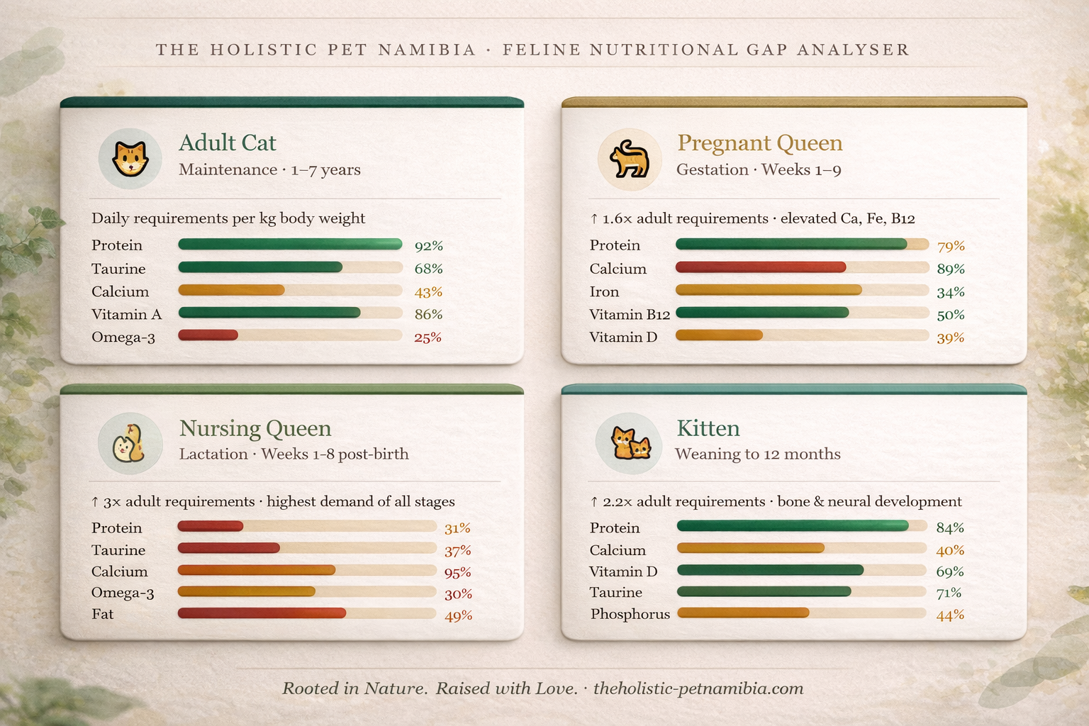 The Feline Nutritional Gap Analyser takes the guesswork out of feline nutrition entirely. It is a comprehensive, interactive, once-off digital tool that analyses your cat’s daily diet against the established nutritional requirements for their specific life stage — and shows you exactly where the gaps are, what’s adequate, and what may be in excess.