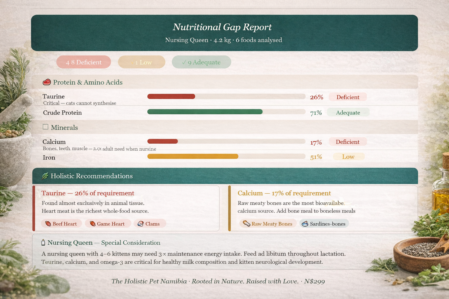 Beyond the nutrient analysis, the tool includes detailed holistic notes for each specialised life stage — covering the unique physiological needs of pregnant queens, nursing queens, and kittens in plain, practical language.