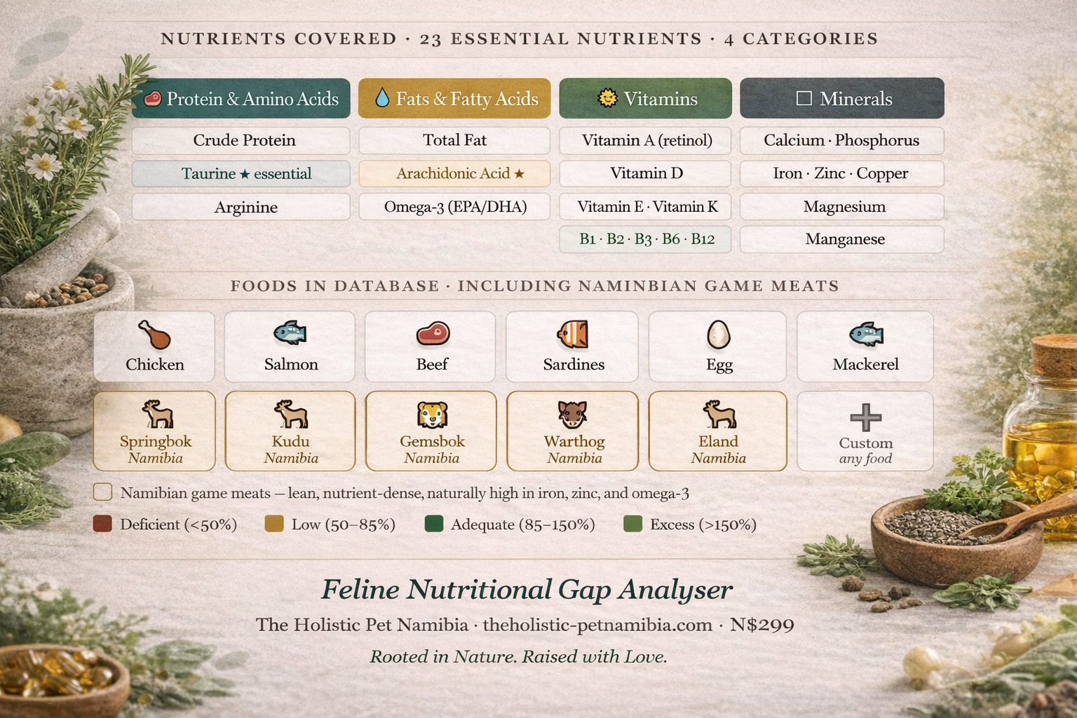 The food database includes over 20 whole foods commonly available in Namibia — including a range of Namibian game meats that are among the most nutritionally clean protein sources available to your cat: