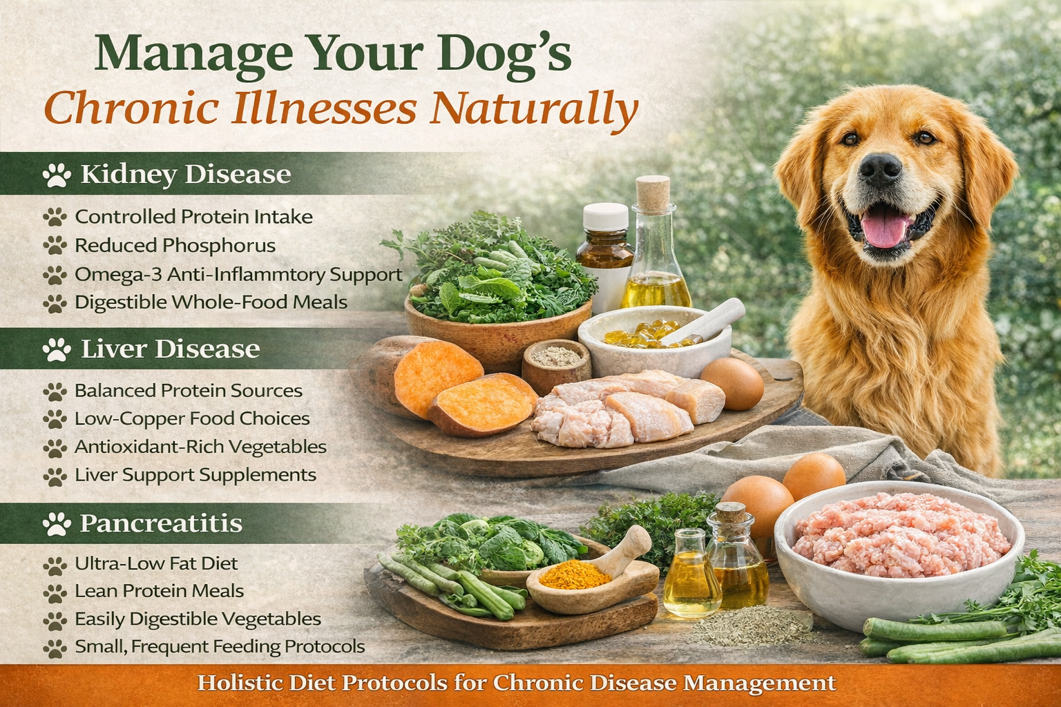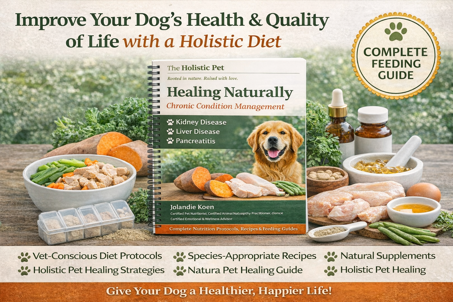 Healing Naturally: Chronic Condition Management is a practical holistic nutrition guide designed to help pet owners support dogs with chronic illness using species-appropriate whole foods, targeted supplements, and structured feeding protocols.