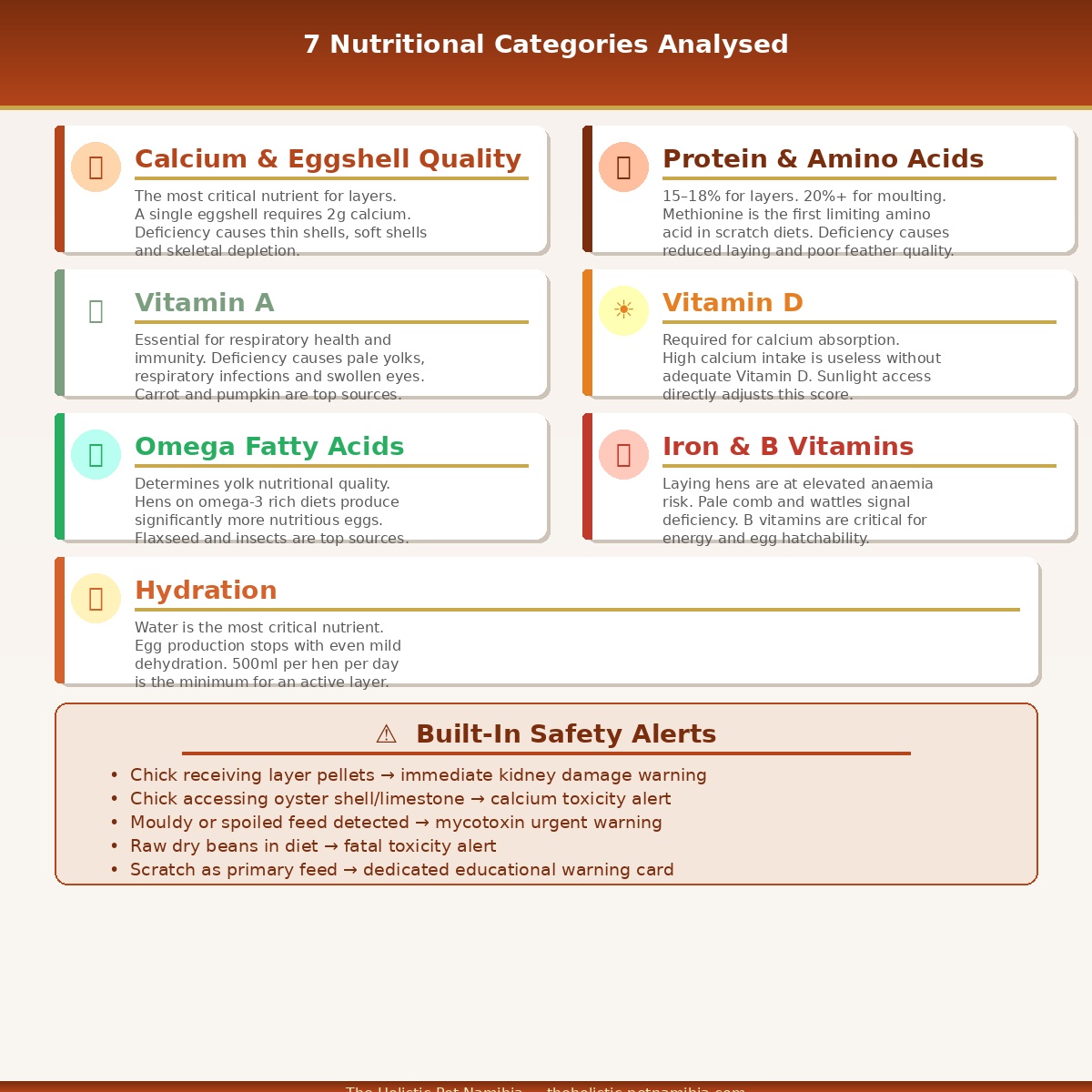 The 7 nutritional categories analysed: Calcium & Eggshell Quality Β· Protein & Amino Acids Β· Vitamin A Β· Vitamin D Β· Omega Fatty Acids & Yolk Quality Β· Iron & B Vitamins Β· Hydration