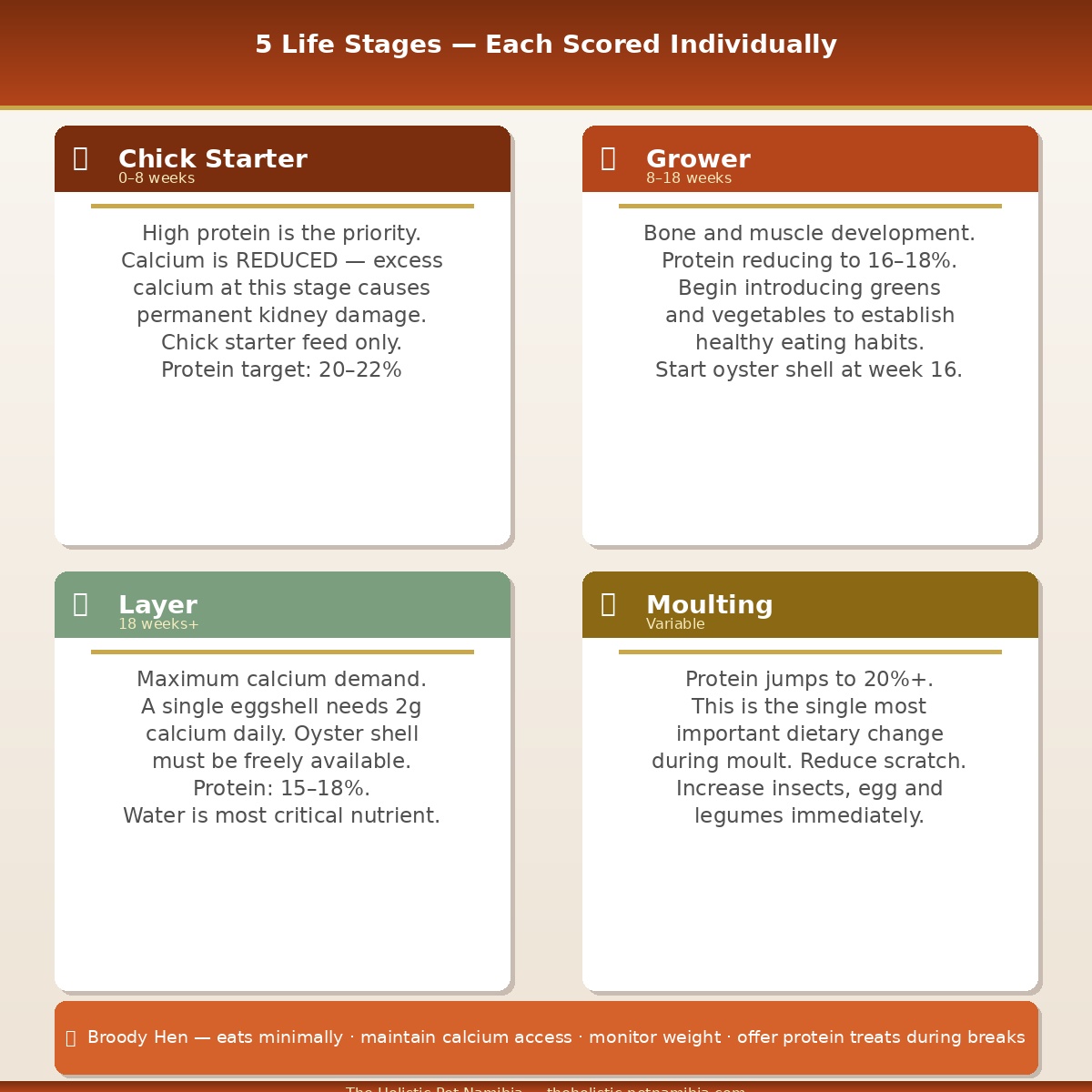 Every stage of a hen’s life carries completely different nutritional priorities. This tool scores each nutrient category based on your flock’s specific stage: