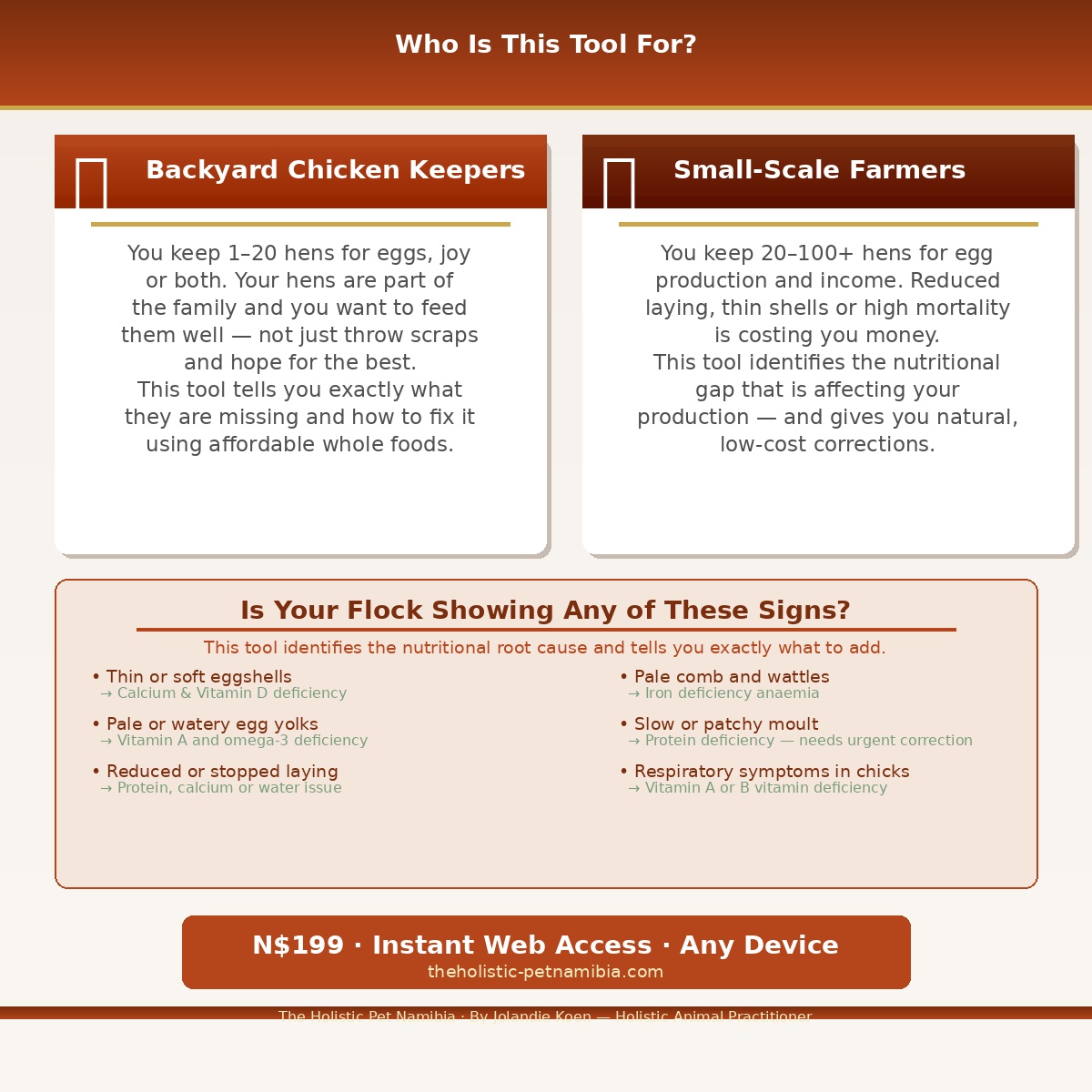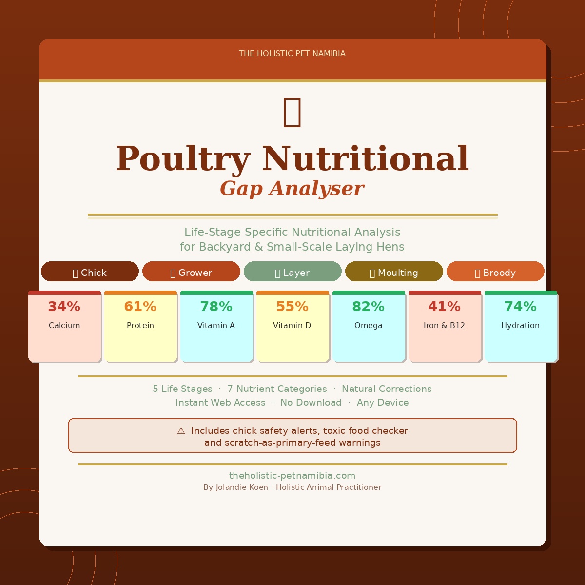 The Poultry Nutritional Gap Analyser is an interactive, life-stage specific nutritional analysis tool for backyard and small-scale laying hens. Created by Jolandie Koen β Holistic Animal Practitioner and Pet Nutritionist β it analyses your flock’s current diet across 7 critical nutritional categories and tells you precisely what is missing and how to correct it using natural, affordable whole foods.